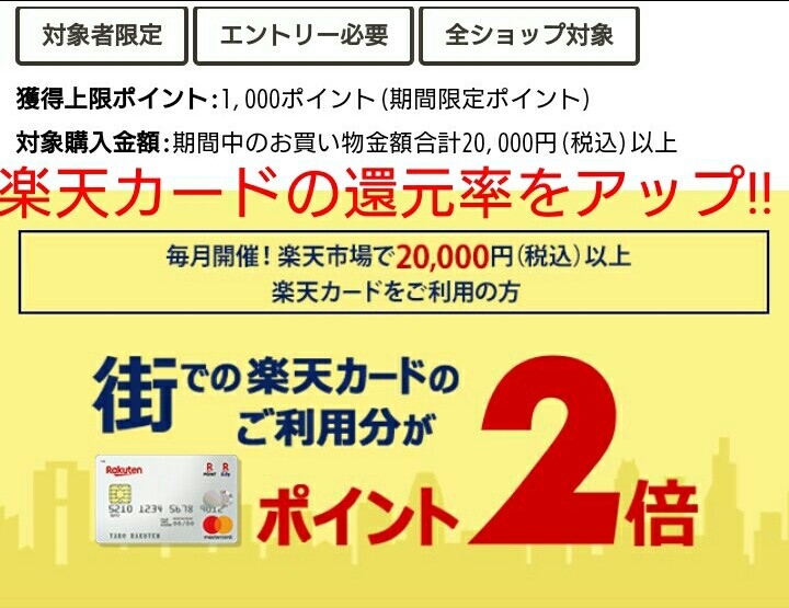 楽天市場で2万円以上楽天カード利用 で街での支払分がポイント2倍