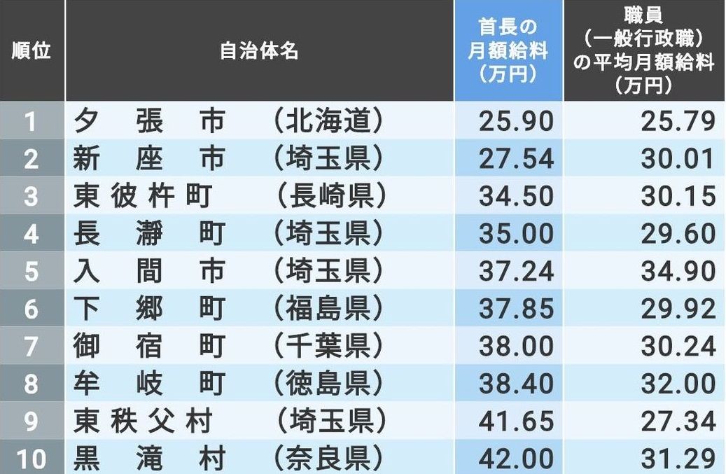 市町村長の月給が低い自治体 ワースト500 賃金 生涯給料ランキング
